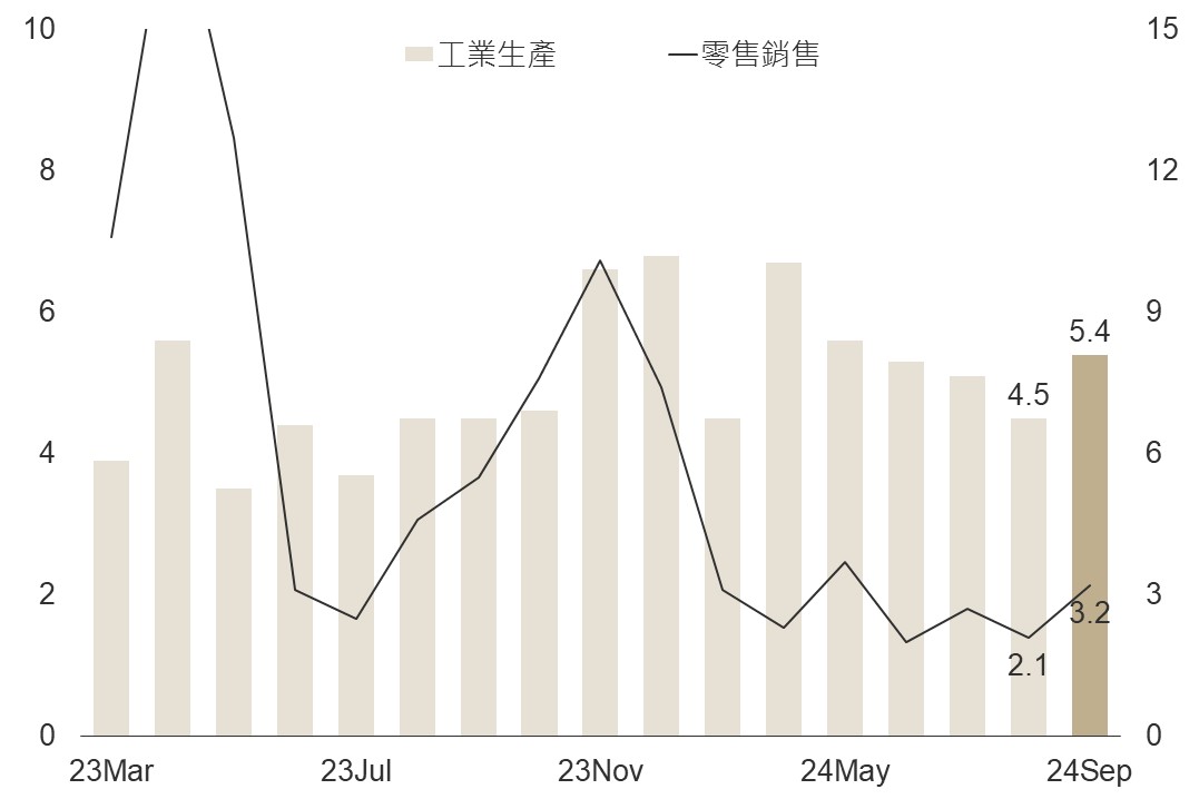 綜觀中國經濟現況,出口由先前一貫強勁放緩,甚至面臨制裁風險,房地產則在政策支持背景中尋求落底,惟較好跡象主要支撐項目-製造業仍強勁,表現低迷的零售銷售則優於市場預期,整體而言中國經濟初現改善;Q3 GDP雖說如預期放緩,但亦高於市場預期。