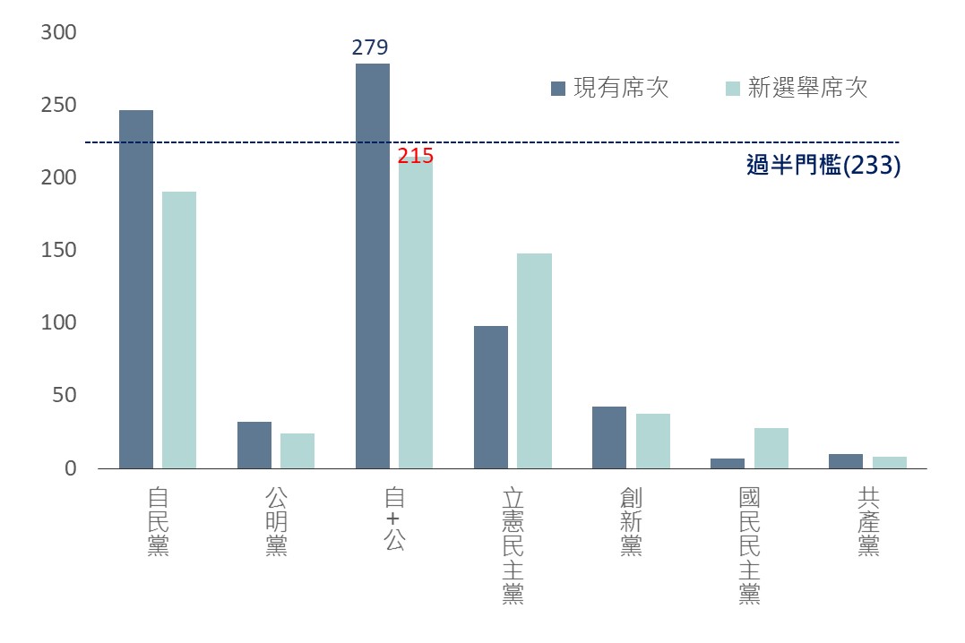 日本眾議院於10/27舉行選舉,當前執政黨(自民黨)因政治獻金醜聞引起公眾不滿,已使前任領導人岸田文雄引咎下台,且新領導人石破茂支持率偏低,最新民調顯示此次將打破以往慣例,自民黨無法於眾議院取得過半席次,且甚至與長期盟友公明黨合組執政聯盟也有無法過半的風險,而需與反對黨合作取得執政,或甚至發生政黨輪替,週一凌晨(10/28)最新統計顯示,自民黨和公明黨的執政聯盟已失去多數(過半)席位,而最大反對黨立憲民主黨席次大幅增加,自民黨是否能拉攏其他小黨組政府面臨不確定性,政治擔憂料促短期日股波動。
