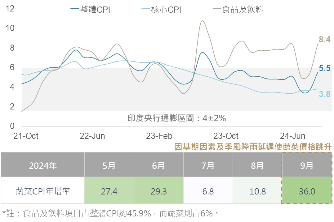 印度9月通膨數據超出市場預期(實際:5.5% vs. 預期:5.1%),使市場對央行降息時點的預期延後可能性上升。整體物價回升主要是蔬菜受強降雨影響導致供應不足及基期效果大幅彈升所致,然扣除食品與燃料的核心通膨增速穩定,上週央行公布的會議紀要顯示多數官員雖謹慎看待物價上行風險,但皆對通膨進展感到更加樂觀,而部分官員已轉偏關注成長前景,因此評估最快12月展開降息的機會依舊存在。