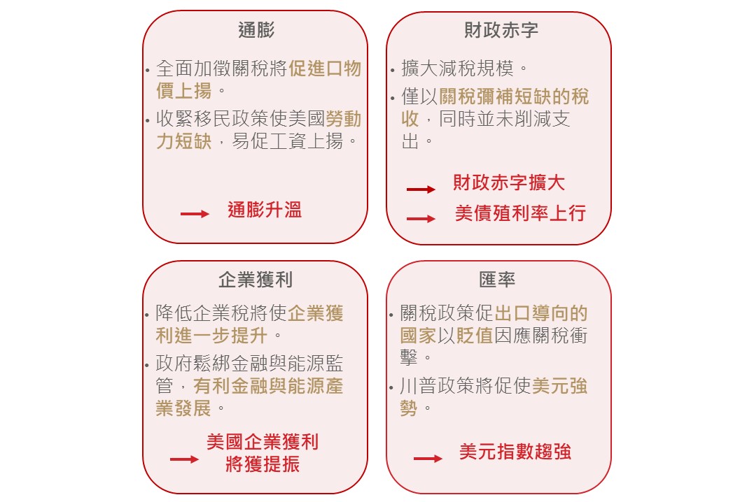 2024年美國總統與國會大選的結果,將以川普與共和黨全面執政的機率最高,紅色浪潮之下,川普的關稅及降稅政策將更易推動 。整體而言,造成的影響體現在以下四個面向: