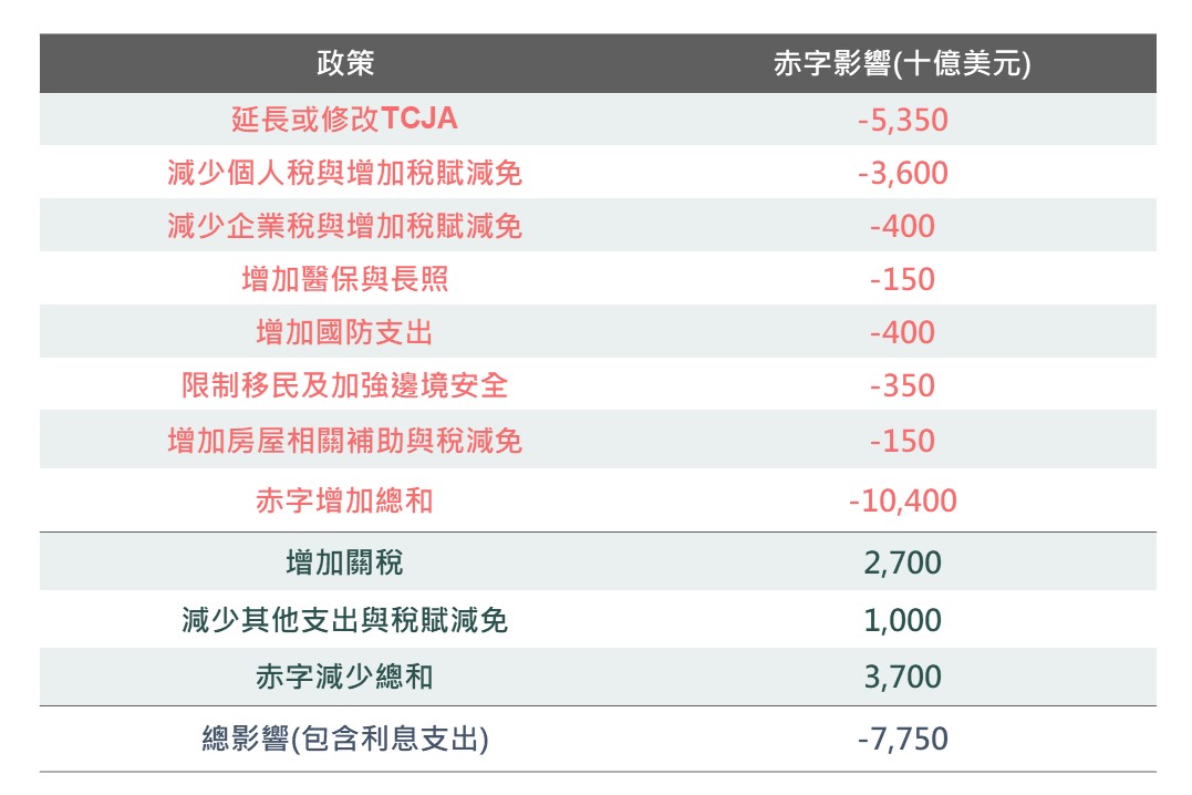 隨川普於總統大選中獲勝,其選前釋出包含延長或再降低減稅與就業法(TCJA)、對個人及企業稅賦減免、國防支出增加等政策有望落實,而此些政策可能會使得美國赤字面臨攀升風險。根據美國盡責聯邦預算委員會預估,擴張性財政政策將為美國增加10.4兆美元赤字;雖另一方面川普主張藉由對外國課取關稅以增加政府稅收,緩解財政赤字壓力,但綜觀整體未來10年川普政策仍將增加美國7.75兆美元赤字。