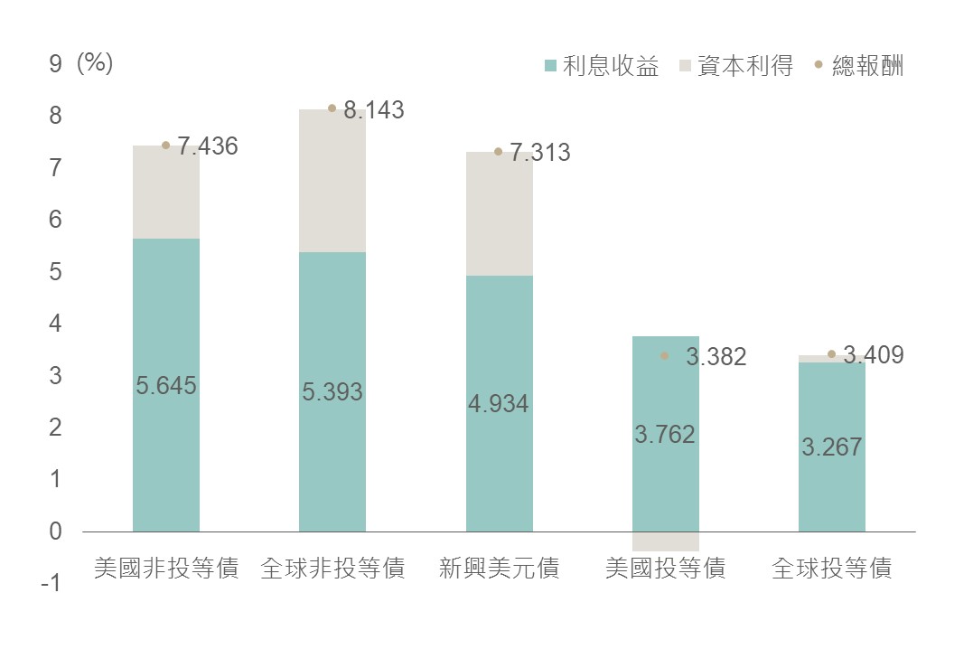 在預估殖利率將保持高位更長時間下,評估當前配置債券主要收入來源仍於息收,而獲取資本利得空間時間將後延,故債券布局建議以高息收與受益於美國經濟保持強韌之美國非投等債為主,輔以美國為主之投等債與新興美元債。
