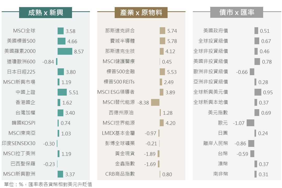 上週金融市場三件眾所矚目的事件-美國大選、Fed降息,及中國發布刺激政策集中在同一週發生,其中影響最大的美國選後行情及川普交易,加上Fed降息1碼,大致上主導了上週金融市場的普遍漲勢。