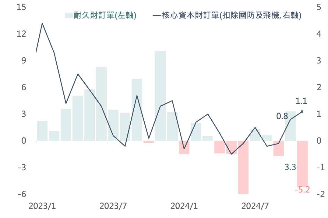 美國公布11月耐久財訂單初值,其年比自前月的3.3%下降至-5.2%,主要反映商用飛機訂單之基期因素影響(年比-55.4%),惟若觀察扣除飛機及國防之核心資本財訂單年比自0.8%升至1.1%,其中包含