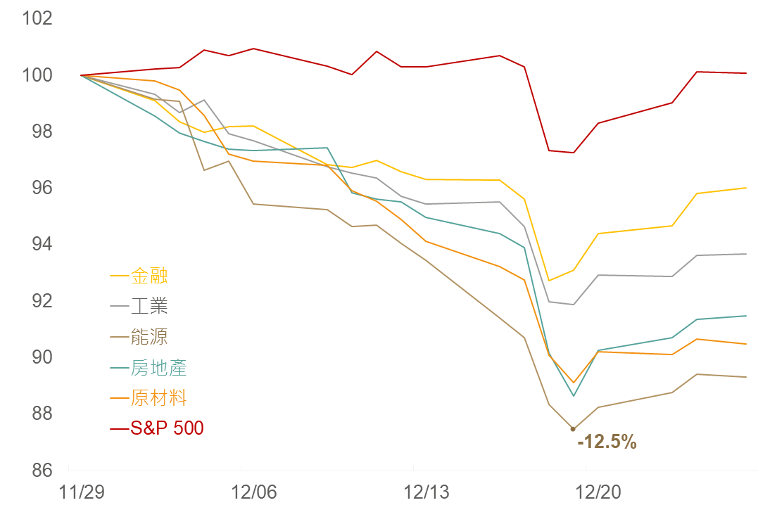 ▲ 近一個月標普週期股與大盤回撤幅度