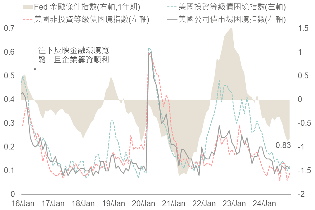 受惠市場風險偏好增加,債市利差收斂疊加美股主要指數回升,觀察Fed11月金融條件指數已降至-0.83,同時投等或非投等債困境指數亦降至接近疫情前水準,反映目前籌資環境對於企業更加友善,