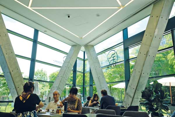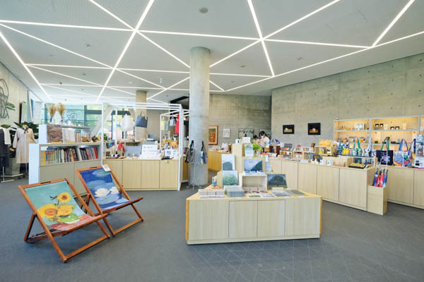 為因應臺灣多地震的環境,團隊特意將美術館內的柱子設計成以傾斜V形鋼架支撐,打造出穩固又富有動感的結構,同時也為戶外空間延伸出如騎樓般的遮蔭區,並透過三面落地玻璃窗引入室外的盎然綠意,讓人能在此悠然駐足、休憩。安藤忠雄曾說:「建築不只是空間的堆疊,更是人與自然、藝術之間的對話。」尤其在這棟建築裡,更加真切地感受到大師所說的那份融合。