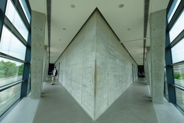 除了正三角形的特色之外,建築材質則是採用安藤忠雄知名的清水模工法,展現極簡卻充滿力量的建築語彙。