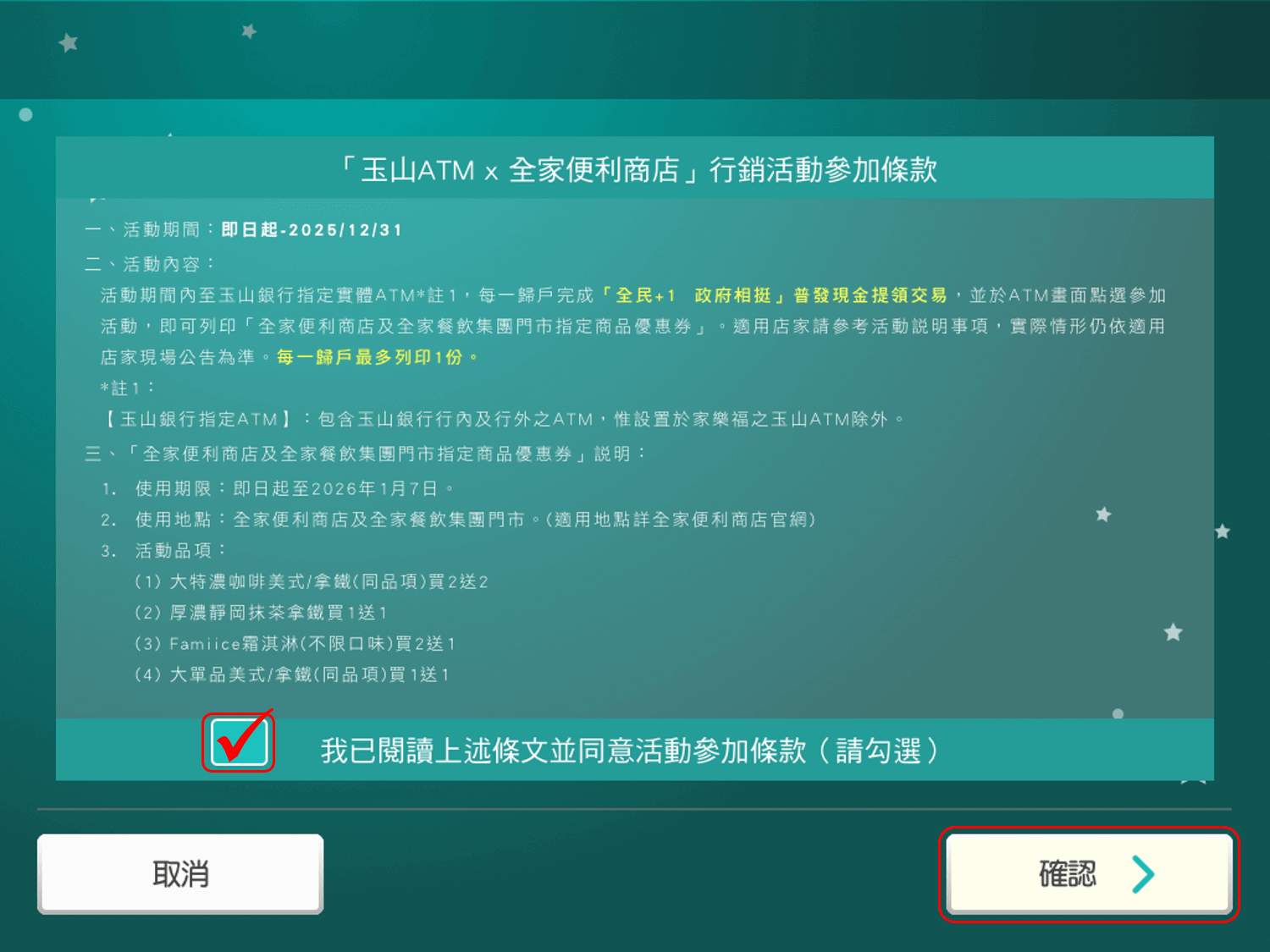 STEP10. 閱讀行銷活動參加條款,勾選同意上述條文並點選「確認」