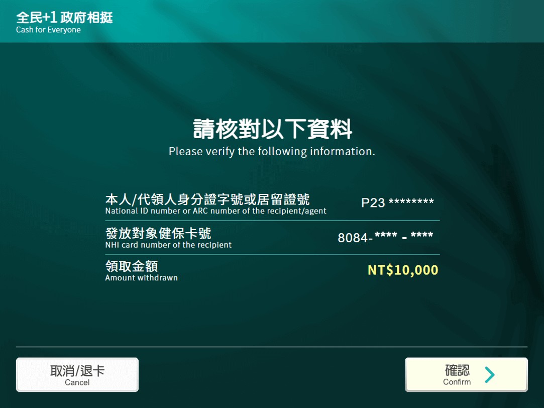 STEP6. 確認[本人/代領人身分證字號]及[發放對象健保卡卡號]