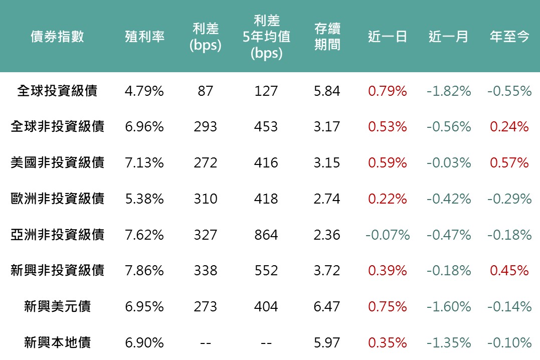 昨日美國公布CPI數據,其中核心CPI增速低於市場預期,緩解市場先前因經濟數據強勁,而過度悲觀預期Fed年內將大幅縮減降息,觀察FedWatch利率期貨顯示,CPI數據公布後市場對Fed年內首度降息時間提前至6月,並增加年內降息2碼預期,降息預期提升促使昨日各天期公債殖利率明顯下行,美國10年債殖利率降至4.65%,而各債種配合債券利差收斂,使全球投等債上漲0.79%、美國非投等債上漲0.59%、新興美元及本地債分別上漲0.75%、0.35%。