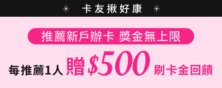 持玉山寶雅聯名卡的正卡持卡人(推薦人),每成功推薦一位新戶首次申辦玉山寶雅聯名卡正卡(被推薦人) ,且被推薦人於核卡後45天內任新增任一筆一般消費不限金額,推薦人即可獲得500元刷卡金(回饋無上限)。